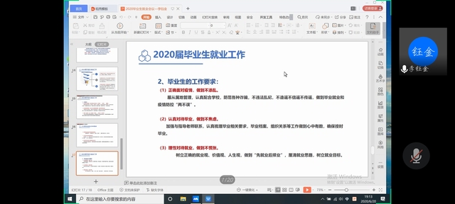 会议开始,李钰金为毕业生们分析了就业形势以及就业相关工作的注意事项,希望毕业生们能够做好相关的就业工作,能够正确面对疫情影响,适时做好职业生涯规划和调整择业标准,提升就业积极性。