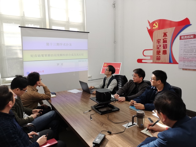 青年工作室成立仪式之后举行了第十三期学术沙龙活动,黄文灿、魏子淏、王雷、 王赛、李敬、孔青、吴浩浩、王凯强、罗克、王国庆等青年教师参加。学院“青年英才工程”罗克老师做了“短直链葡聚糖自组装颗粒的合成及应用”的精彩报告,老师们针对此研究展开了热烈讨论。林洪教授对罗克老师方向的凝练和未来规划提出指导性意见。集体交流结束后,部分老师仍在沙龙会场继续交流。