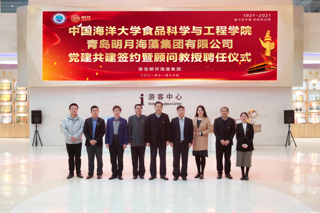 明月海藻集团和海大食品学院已有几十年的合作历程,双方在科学研究、人才培养等方面有着非常成功的合作先例。在开展产学研合作的同时,为贯彻落实好习近平新时代中国特色社会主义思想和党的十九大精神,全面加强党的领导,推动党史学习教育走深走实,双方协商达成党建共建协议。希望通过共享党建资源、开展党建交流等形式,实现“以共建促党建,以共建促合作,以共建促发展”的目标,不断提升双方的党建工作水平,促进学院和企业科研创新与人才培养的良性发展,共同为海洋强国建设和“健康中国”建设做出应有的贡献。