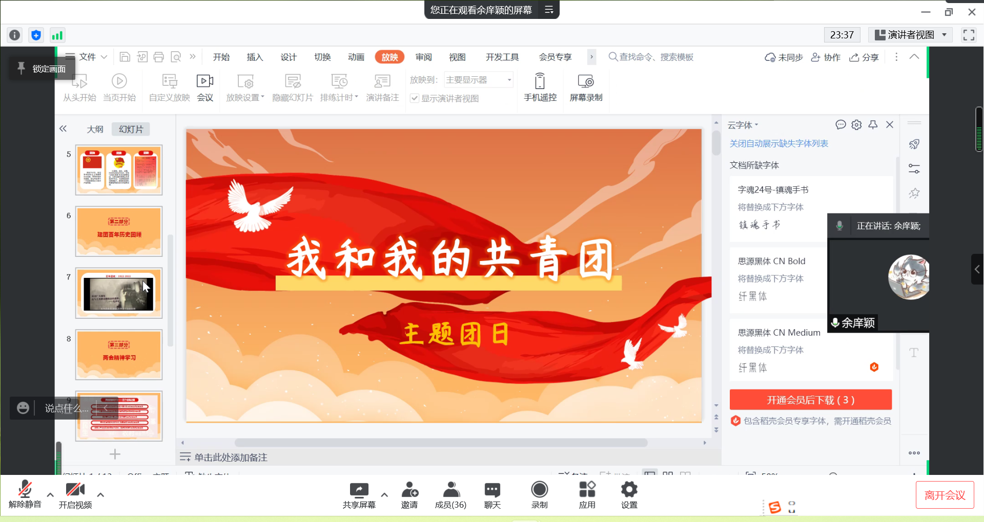 随后,班级宣传委员余庠颖主持了“我和我的共青团”主题团会,辅导员张川和班级全体同学参加。团会第一部分,余庠颖带领同学们共同回顾了共青团的相关基本知识,随后,集体观看了建团百年历史回顾的总结视频。“百年风雨兼程,一路筚路蓝缕”,先辈们艰苦卓绝的奋斗故事让同学们敬佩不已,也激励了更多的青年团员在未来为祖国建设和民族复兴贡献自己的青春力量。最后,同学们共同学习了两会精神并就两会相关话题展开讨论。