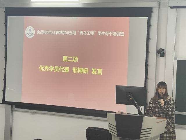 本站讯 2022年12月1日下午,食品科学与工程学院第五期“青马工程”学生骨干培训班结班仪式在西海岸校区学习综合体南305顺利召开。学院党委副书记、副院长程振明,团委书记李想,团委副书记张川,辅导员丁晨阳以及第五期“青马工程”培训班全体学员出席结业式。