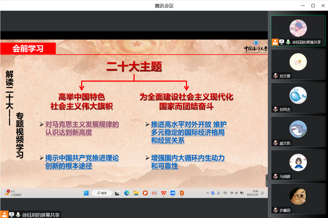 首先,徐钰玥以专题视频学习的形式带领同学们对党的二十大主题进行了解读。徐钰玥针对党的二十大主题的两个方面高举中国特色社会主义伟大旗帜和为全面建设社会主义现代化国家而团结奋斗播放了专题视频,并分享了自己学习党的二十大的心得感悟。接着,全体参会人员共唱团歌。朝气蓬勃、青春嘹亮的团歌唤起了同学们高昂的斗志和热血活力。