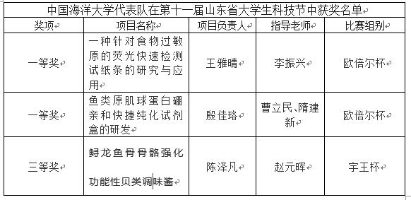 本站讯 10月12-13日,由山东省科学技术协会、山东省教育厅等六部门联合主办,山东省食品科学技术学会、威海海洋职业学院等承办的“第十一届山东省大学生科技节——食品加工与安全创新设计大赛”决赛在威海海洋职业学院举办,中国海洋大学食品科学与工程学院的三支队伍参赛,共获得一等奖2项、三等奖1项的优异成绩。同时,隋建新老师获“优秀指导老师”称号。