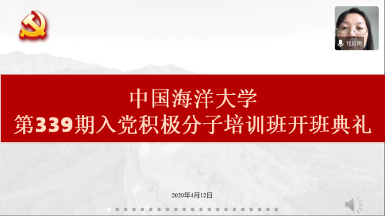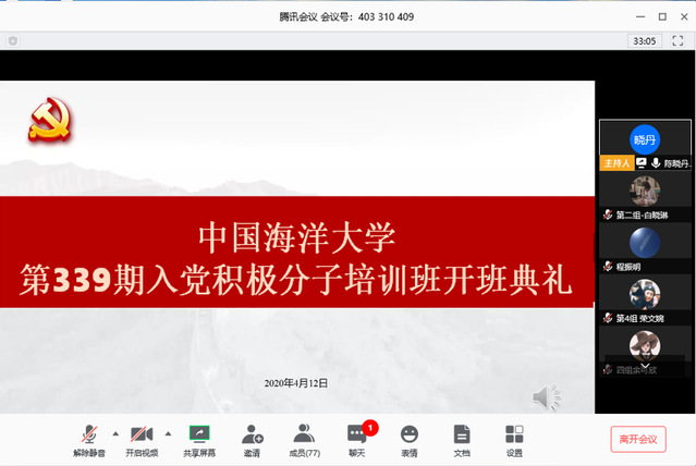 本站讯 412日下午,中国海洋大学339期入党积极分子培训班开班典礼通过腾讯会议线上举行。食品科学与工程学院党委副书记程振明出席开班典礼,开班仪式由食品科学与工程学院辅导员张川主持培训班全体学员参加