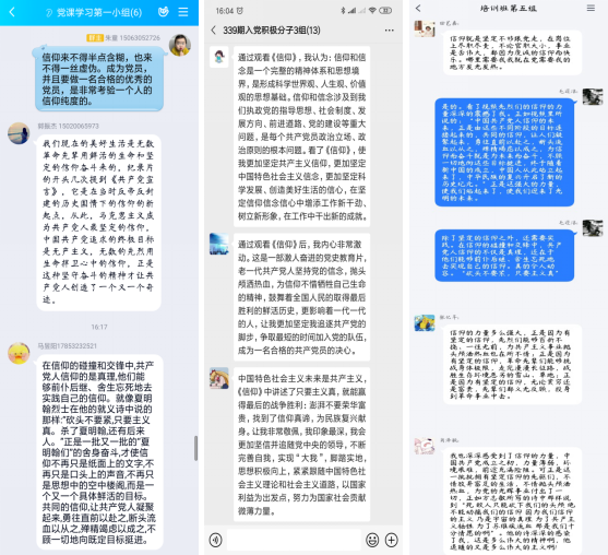 最后进行视频《信仰》-只要主义真的学习,各小组成员分别进行激烈地讨论。其中2018级食品工程研究生朱童提到信仰来不得半点含糊,也来不得一丝虚伪。成为党员,并且要做一名合格的优秀的党员,是非常考验一个人的信仰纯度的。2018级食品科学博士生于闯讲到正是信仰让我们的共产党人在关键时刻挺身而出,与人民同甘共苦,他们的行动无不体现了党与人民的鱼水情怀。