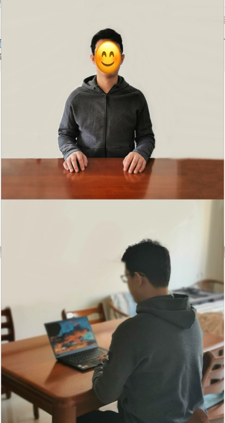 2.准备一台电脑(带摄像头和麦克风)和一部智能手机,或两部智能手机。两台设备中,第一台为主设备(建议使用笔记本或PC机),要求放置在考生座位正前方,视频监控范围应保证考生在坐姿状态下能够完整清晰覆盖头部到桌面位置,面试过程中要始终保持双手在屏幕中显示;另一台为辅助设备,放置于考生后方45度位置,确保监控范围覆盖第一台设备的显示屏幕和考生本人头部、背部、手部,标准规范参考下图。
