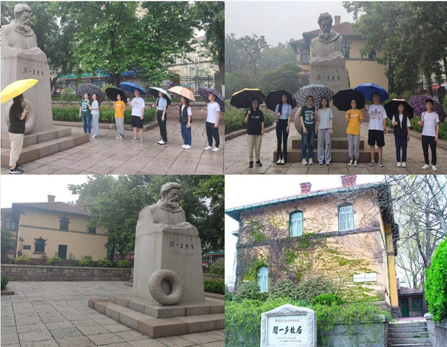 闻一多故居位于青岛中国海洋大学校园西北角,游人从红岛路进入海洋大学4号校门后,向右一拐,便可看到一幢红瓦黄墙古朴典雅的二层小洋楼。这座典型德国风格,看似普通的洋楼小楼就是青岛市重点文物保护单位、民主斗士闻一多先生当年在国立青岛大学任教时的故居。雕塑后侧闻一多先生纪念碑这样写道,“杰出的诗人、学者,人民英烈闻一多先生1930年受聘国立青岛大学,任文学院长兼中文系主任。讲授历代诗选、唐诗、英国诗选等课程。态度亲切民主,既富有学术家风度,又充满浓郁诗情,受到崇敬与热爱。先生爱国忧民,埋头学术研究,从唐诗入手,决心为衰颓之中华民族寻求一个起死回生之文化良方。先生在校,为时仅二年,春风化雨,为国育才。瞻望旧居,回忆先生当年居于斯工作于斯,怀念之情曷可遏止?爰将所居,命名‘一多楼’,略事陈设,依稀旧容,并于庭院立石,以为永念。俾来瞻仰之中外人士,缅怀先生高风亮节而有所取法焉。先生生平事迹,昭昭然在人耳目,兹不缀。”