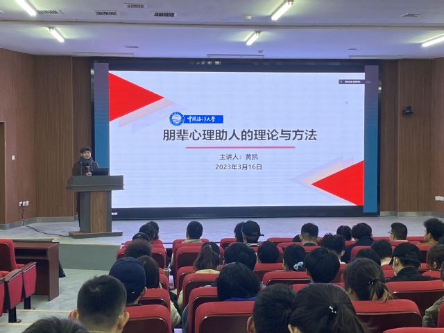 培训会上,学院邀请到了学校心理健康教育与咨询中心黄凯老师,为全体学生干部带来题为《朋辈心理助人的理论与方法》的讲座。讲座伊始,黄凯老师向学生干部们介绍了心理朋辈队伍心理预警工作的主要职责,如何及时发现身边同学可能存在的心理危机,并及时转介给辅导员和心理老师邓,接着,黄凯老师向学生干部们普及了一些常见的心理相关疾病,如抑郁症、双相情感障碍、精神分裂症等疾病的典型症状和病程,以及如何通过同学们的一些行动和话语及时识别可能存在的心理危机。黄凯老师的讲解风趣幽默,还结合工作中的实例,讲解了朋辈心理助人的相关理论和方法。
