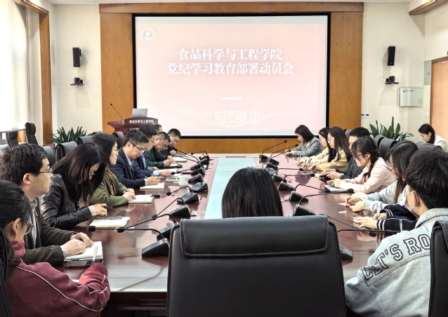本站讯 4月17日,食品科学与工程学院党纪学习教育部署会在食工楼106召开。会议深入学习贯彻习近平总书记关于党纪学习教育的重要讲话和重要指示批示精神,贯彻落实《中共中央办公厅关于在全党开展党纪学习教育的通知》精神,落实学校党纪学习教育工作部署安排,启动部署学院党纪学习教育工作。学院党委书记于德华主持会议并讲话,学院党委副书记、副院长程振明介绍学院党纪学习教育工作安排,学院党委委员、班子成员、师生党支部书记参加会议。