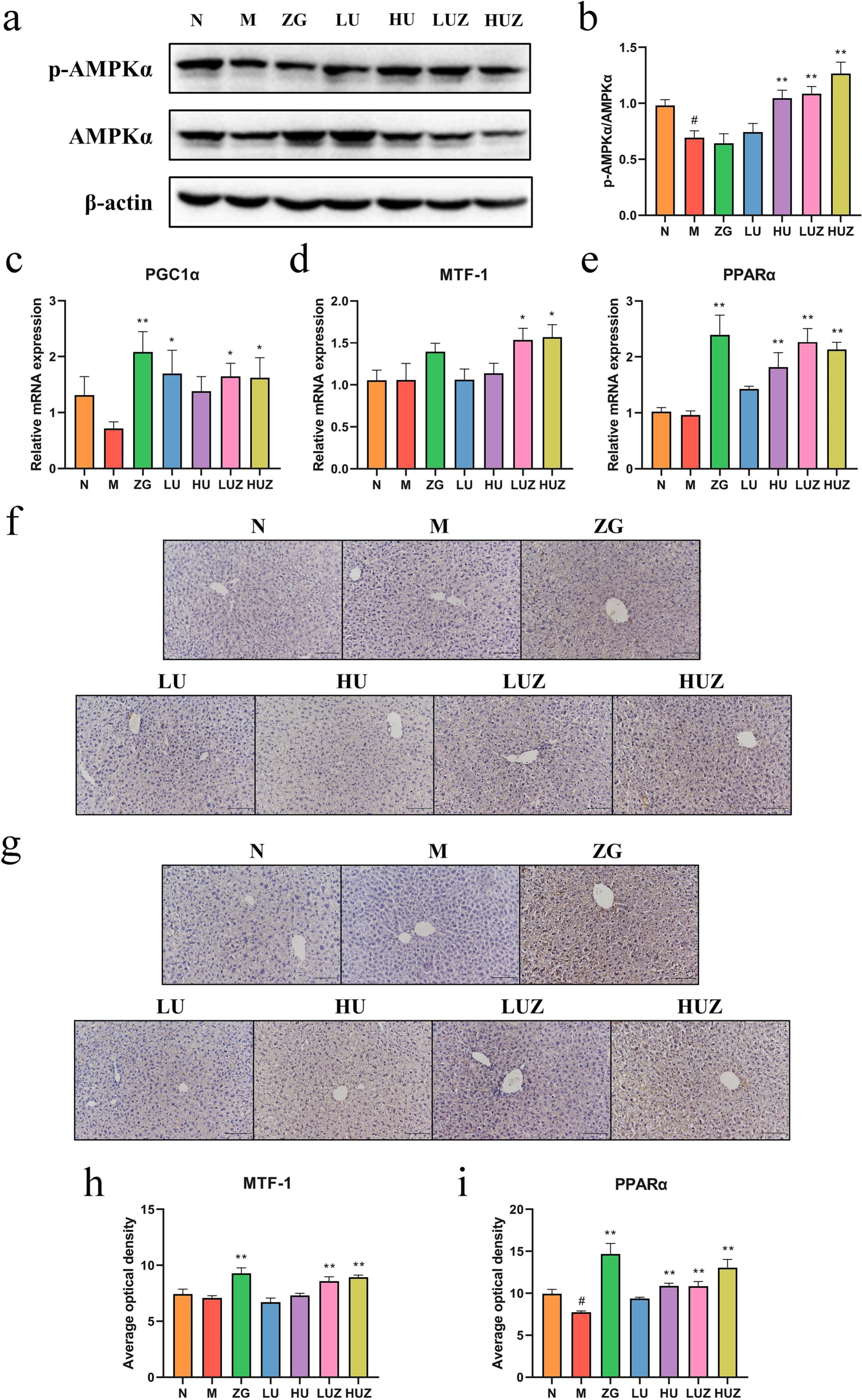 图2. UO 及其锌复合物对高脂日粮喂养小鼠肝脏关键 mRNA 转录和蛋白质表达的影响 (n = 9)。(a、b)AMPK和磷酸化AMPK蛋白表达;(c-e)PGC1α、MTF1和PPARα mRNA转录本;(f,h)MTF1免疫组化分析;(g,i)PPARα免疫组化分析。